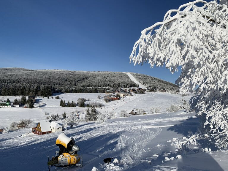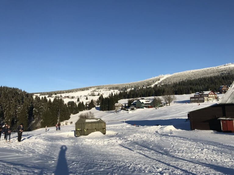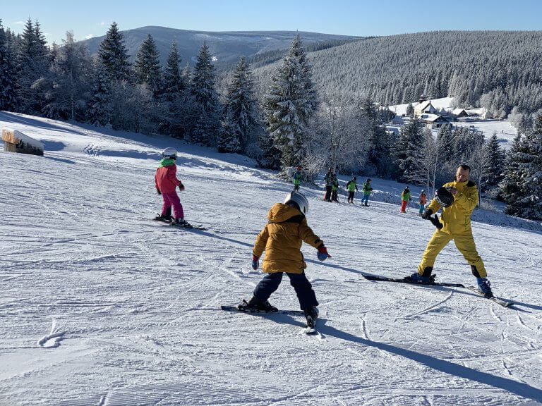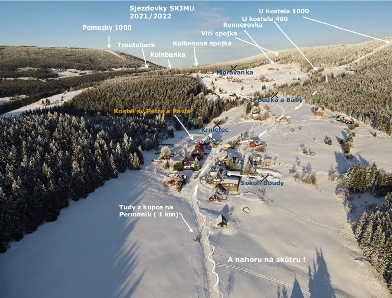 Celý areál je propojený vleky, proto se pohodlně dostanete na lyžích až před Permoník – cesta SKIBUSEM je tedy pouze směrem TAM.