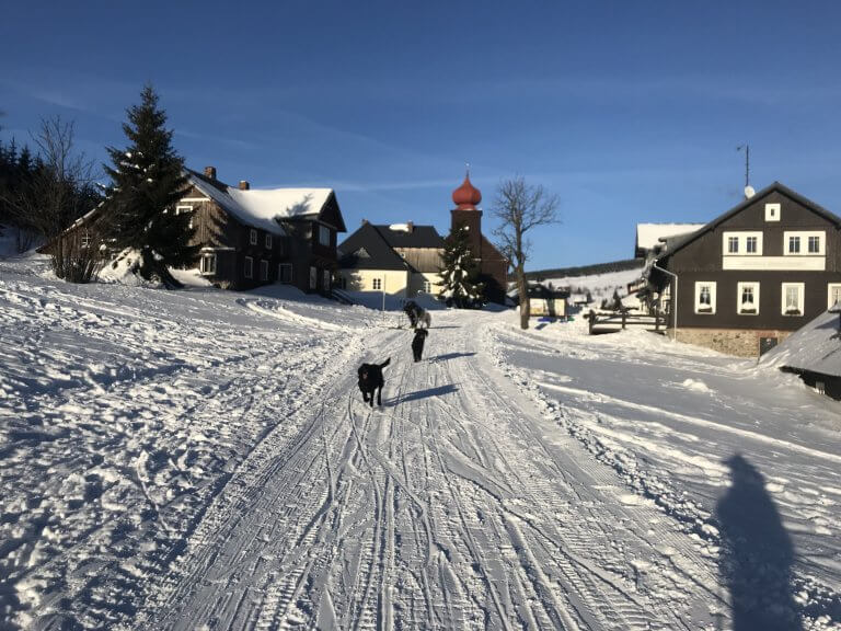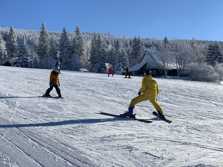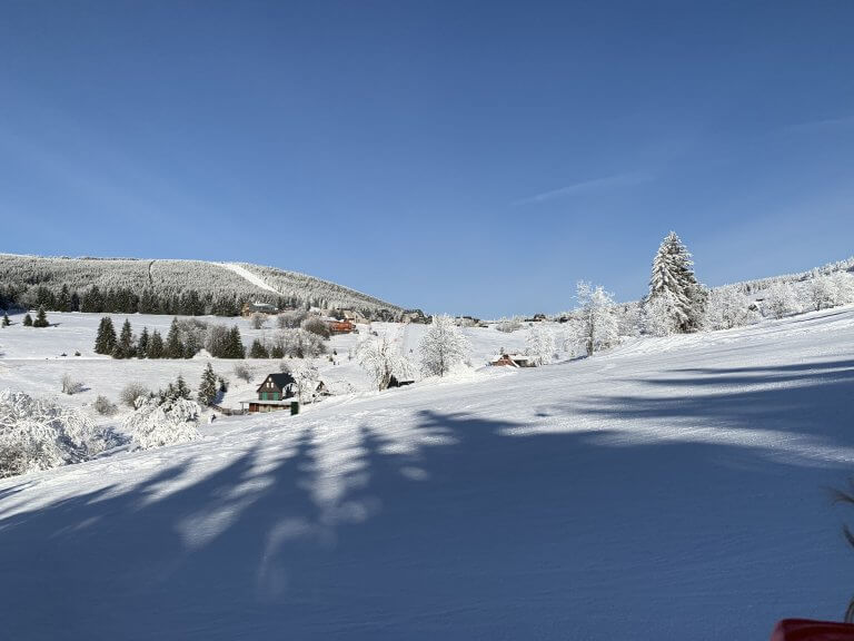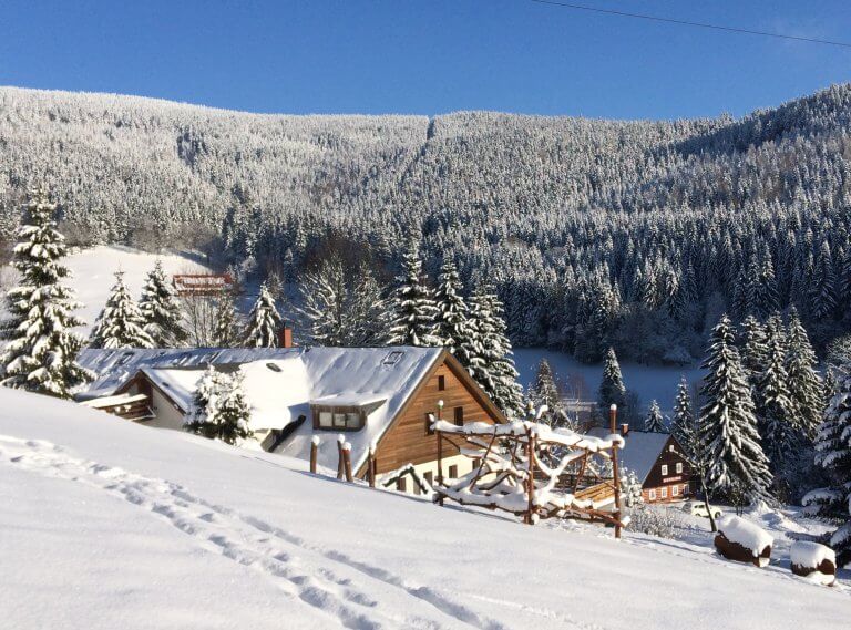 Od nás na lyžích po cestě z kopečka 700 m na SKIBUS a tam už SKIBUSEM ke sjezdovce Pomezky a Trautnberk.